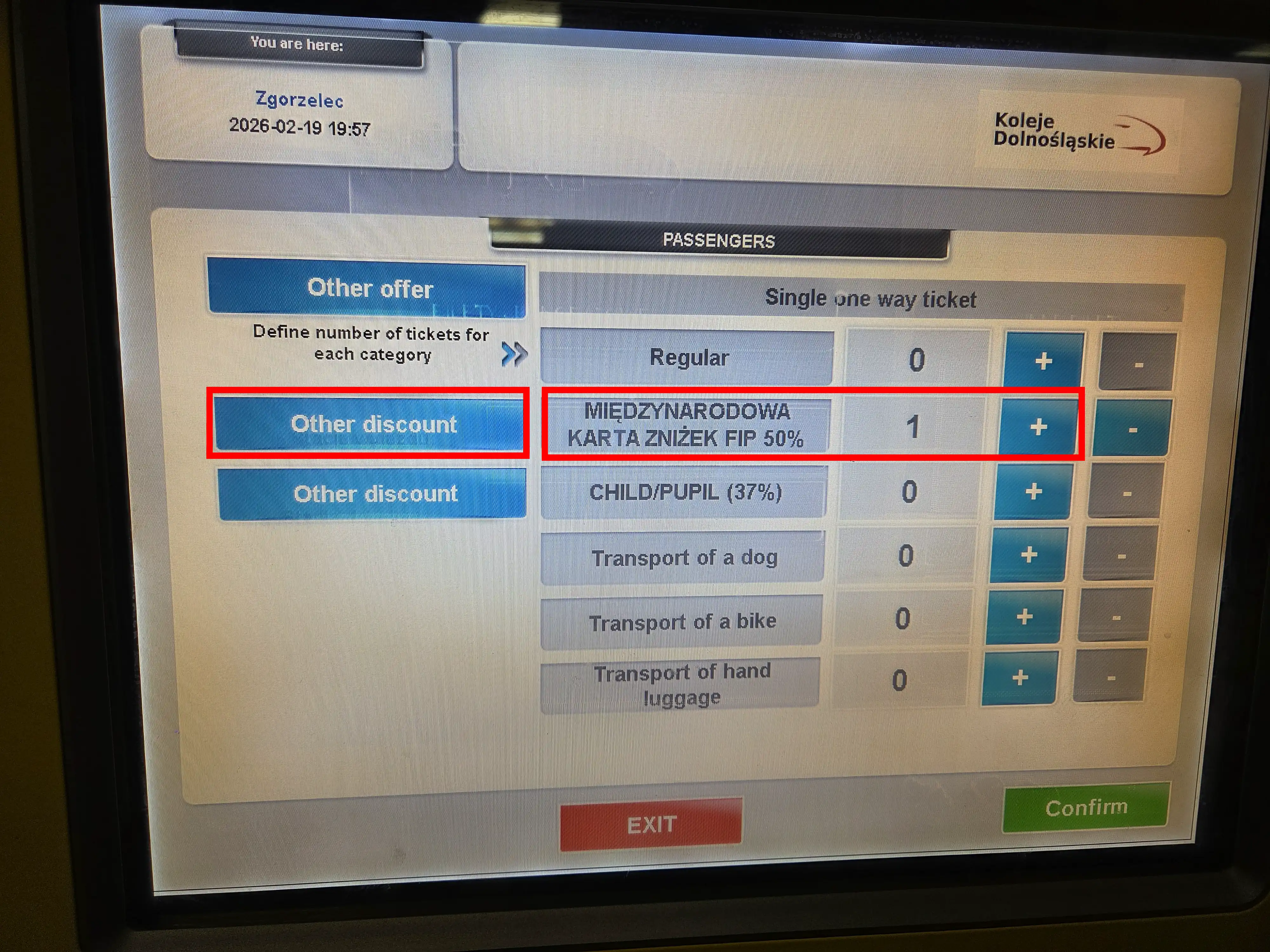 Discounted FIP 50 Tickets can be purchased at the ticket machines. Under “Weitere Rabatte” (further discounts), the discount “Międzynarodowej Karty Zniżek FIP 50%” must be selected. All discount options are spread across multiple pages. Afterwards, the option to add passengers with the discount appears in the previous menu.
