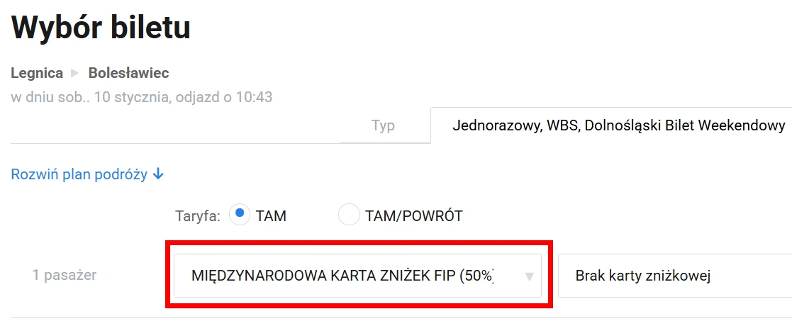 On the Koleo website, tickets with FIP 50 discount can be purchased online for many railway companies in Poland. To do this, FIP 50 must be added once as a discount in the Koleo customer account here.